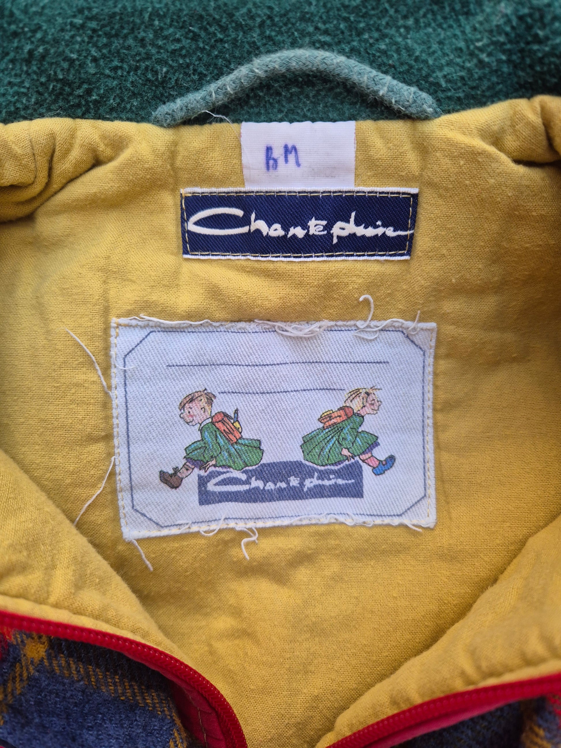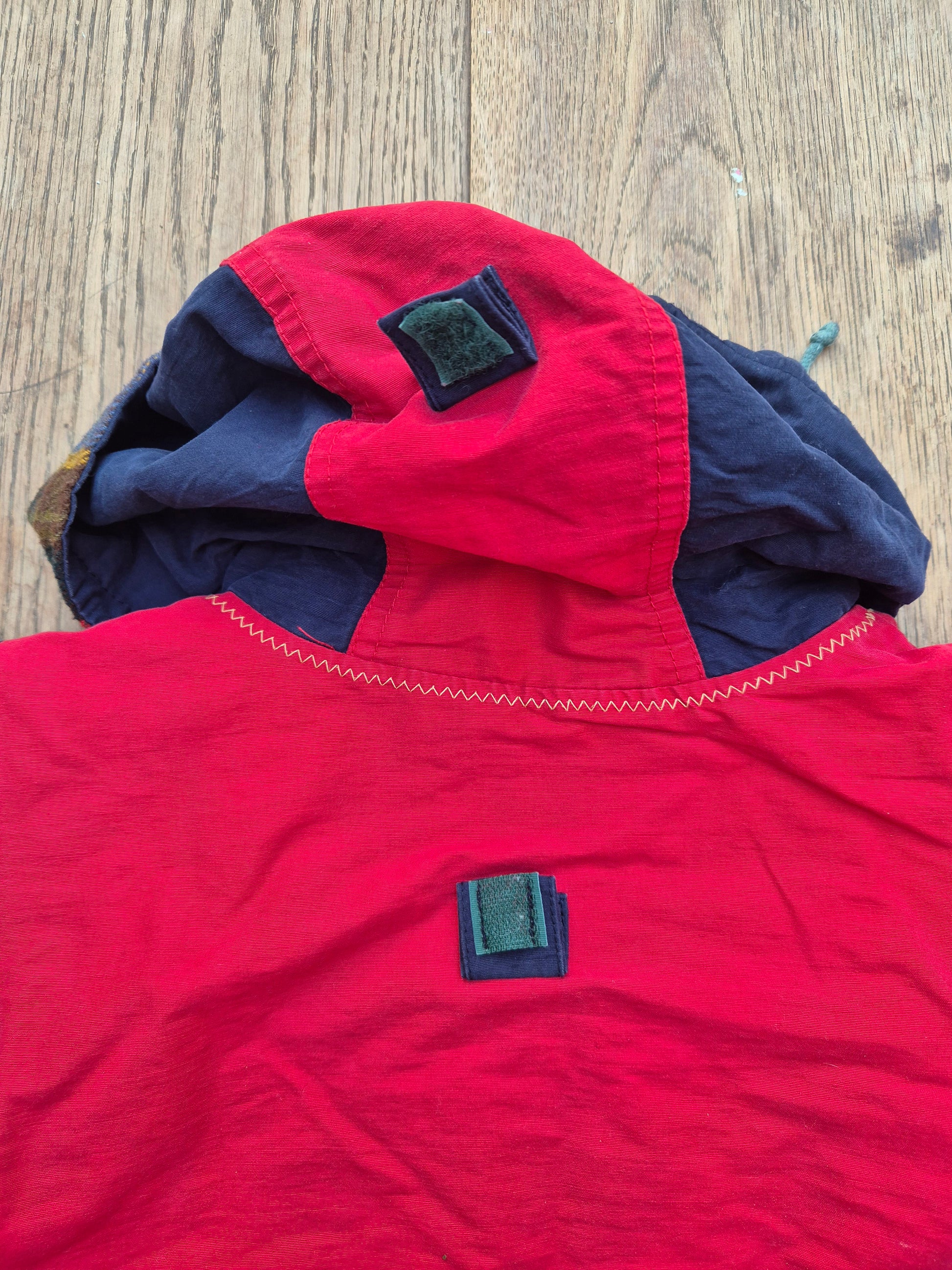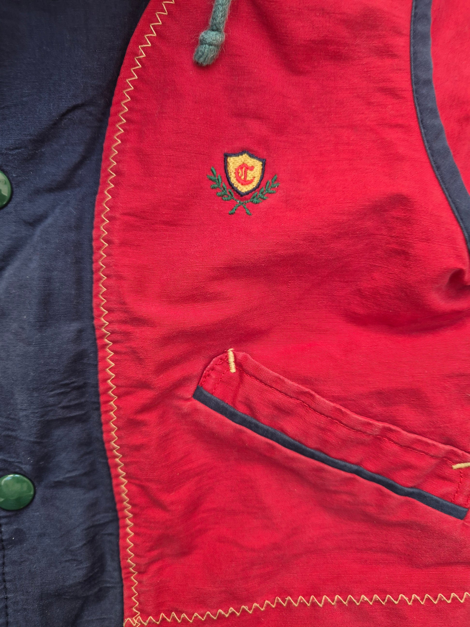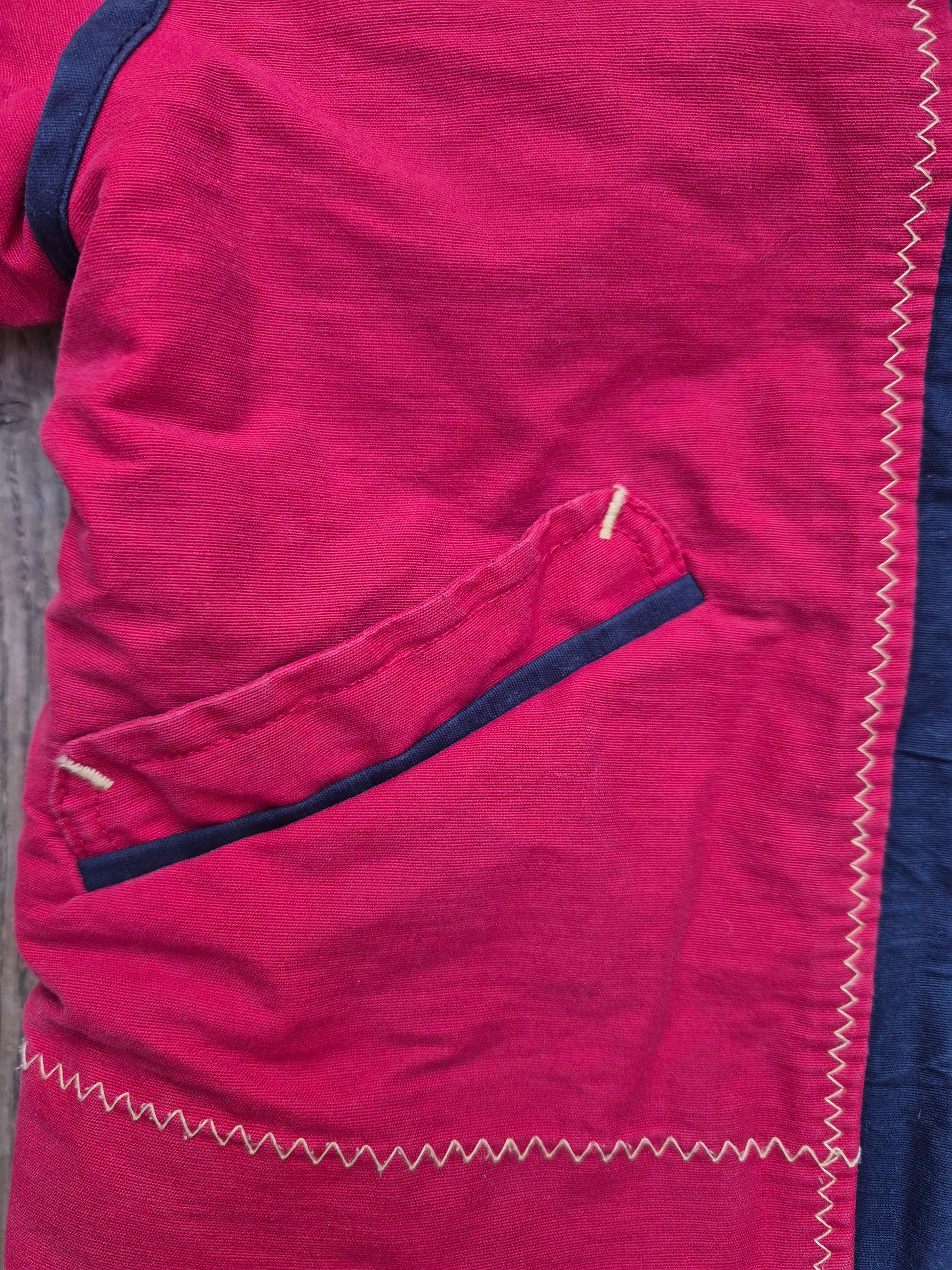 Helemaal in de kerstsfeer, een typische 80’s jas in rood en navy, met fleece binnenkant en geruite capuchonvoering. Lekker warm, met toffe details als contrasterende stiksels en drukknoopsluiting.