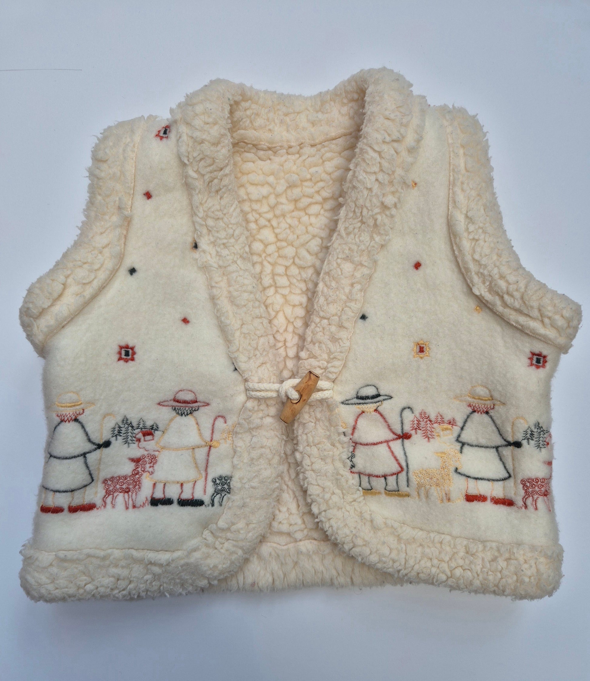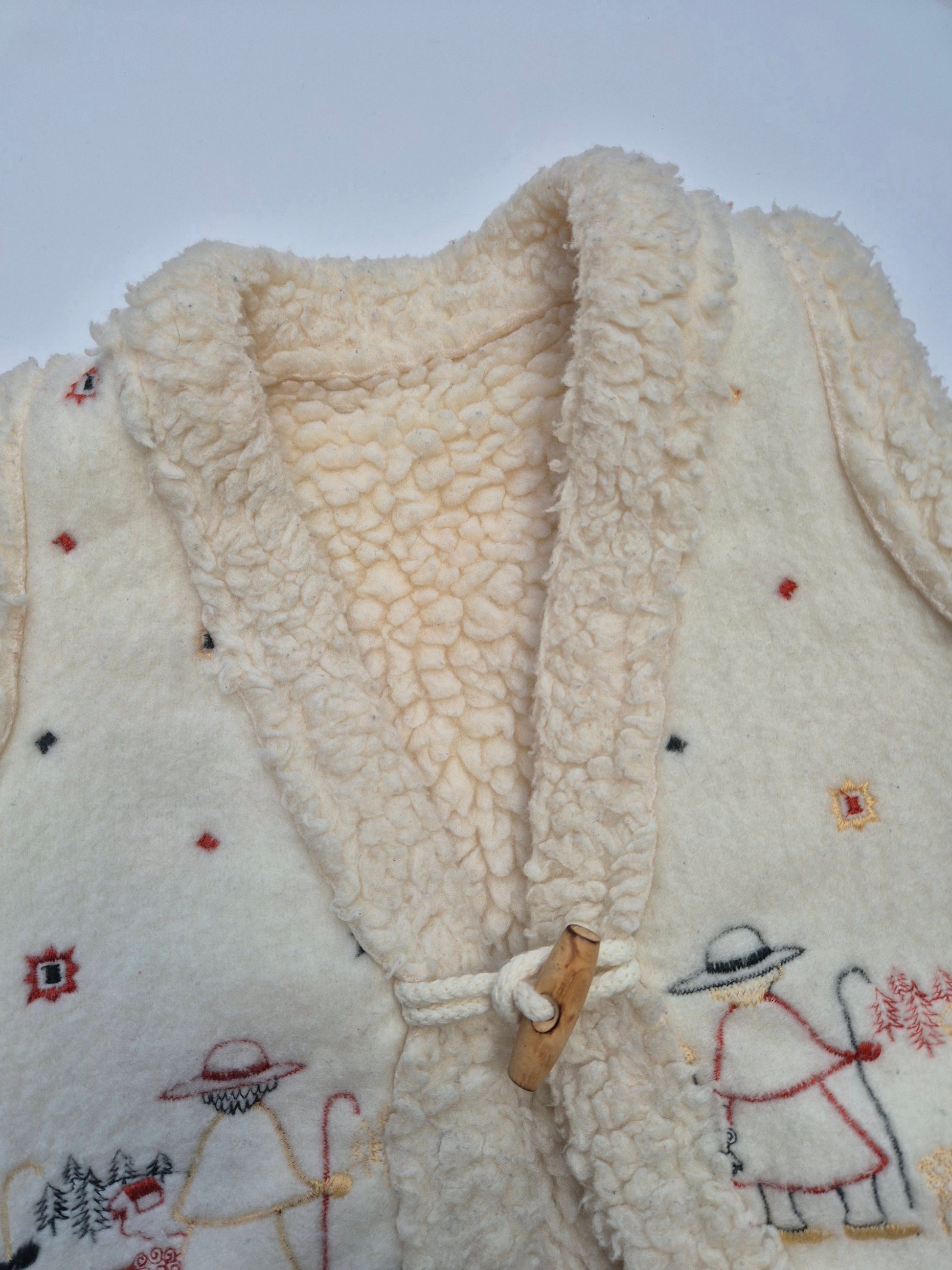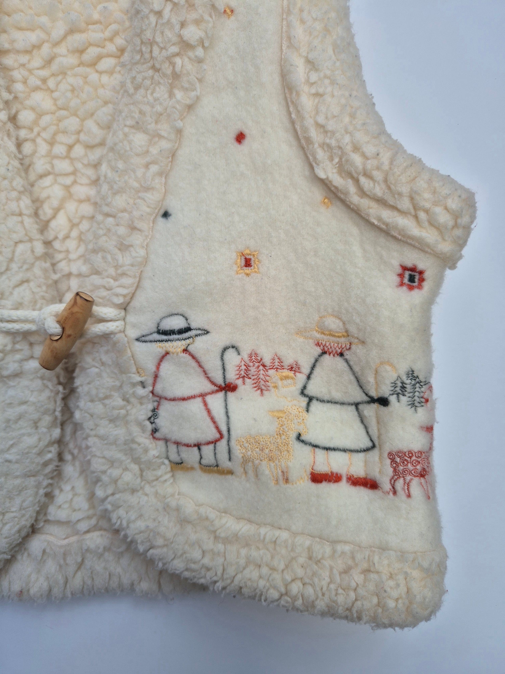 Zachte, wollige bodywarmer met geborduurde herders en dieren. Met houten knoopsluiting en warme voering. Een unieke vondst vol karakter.