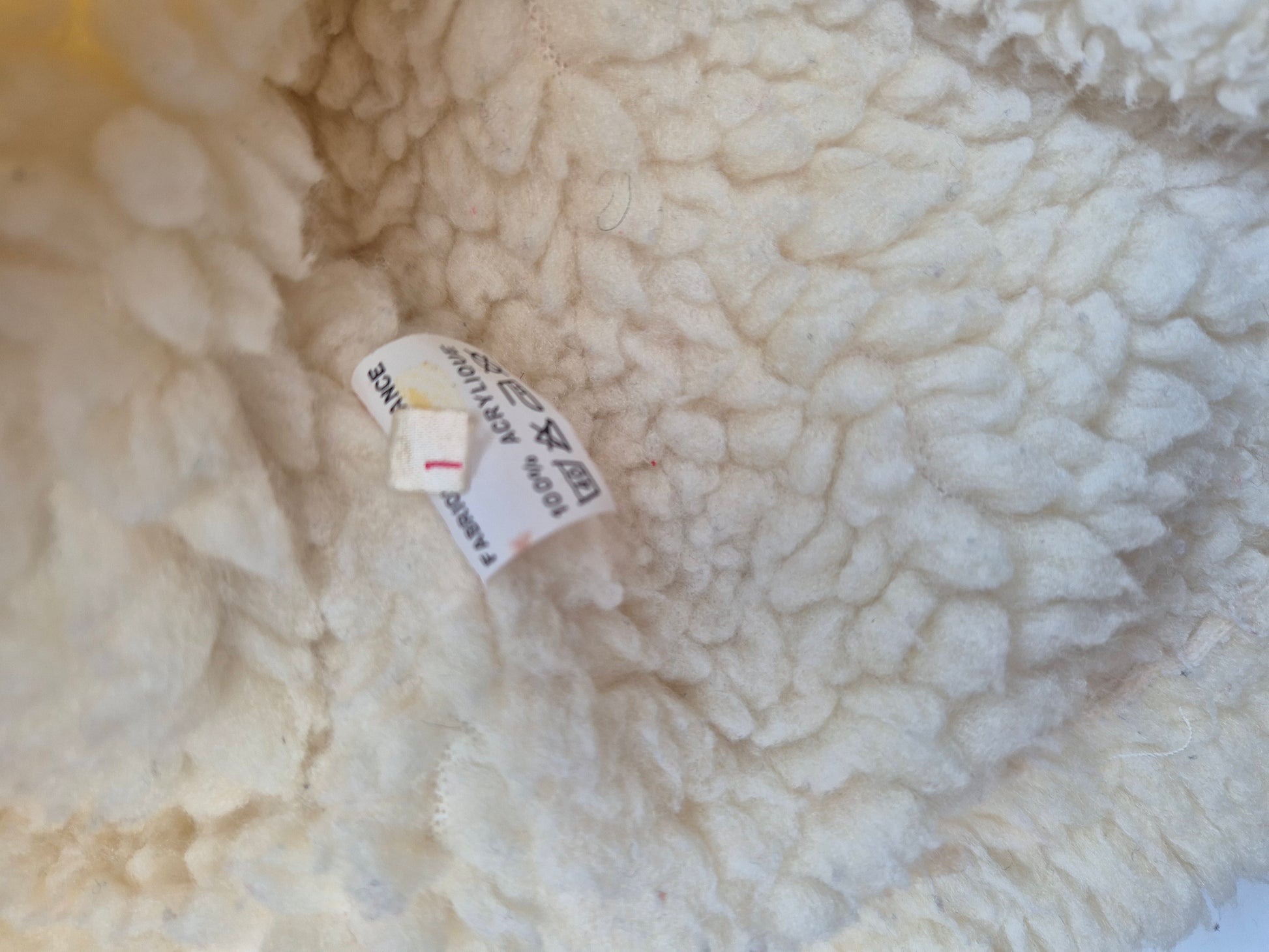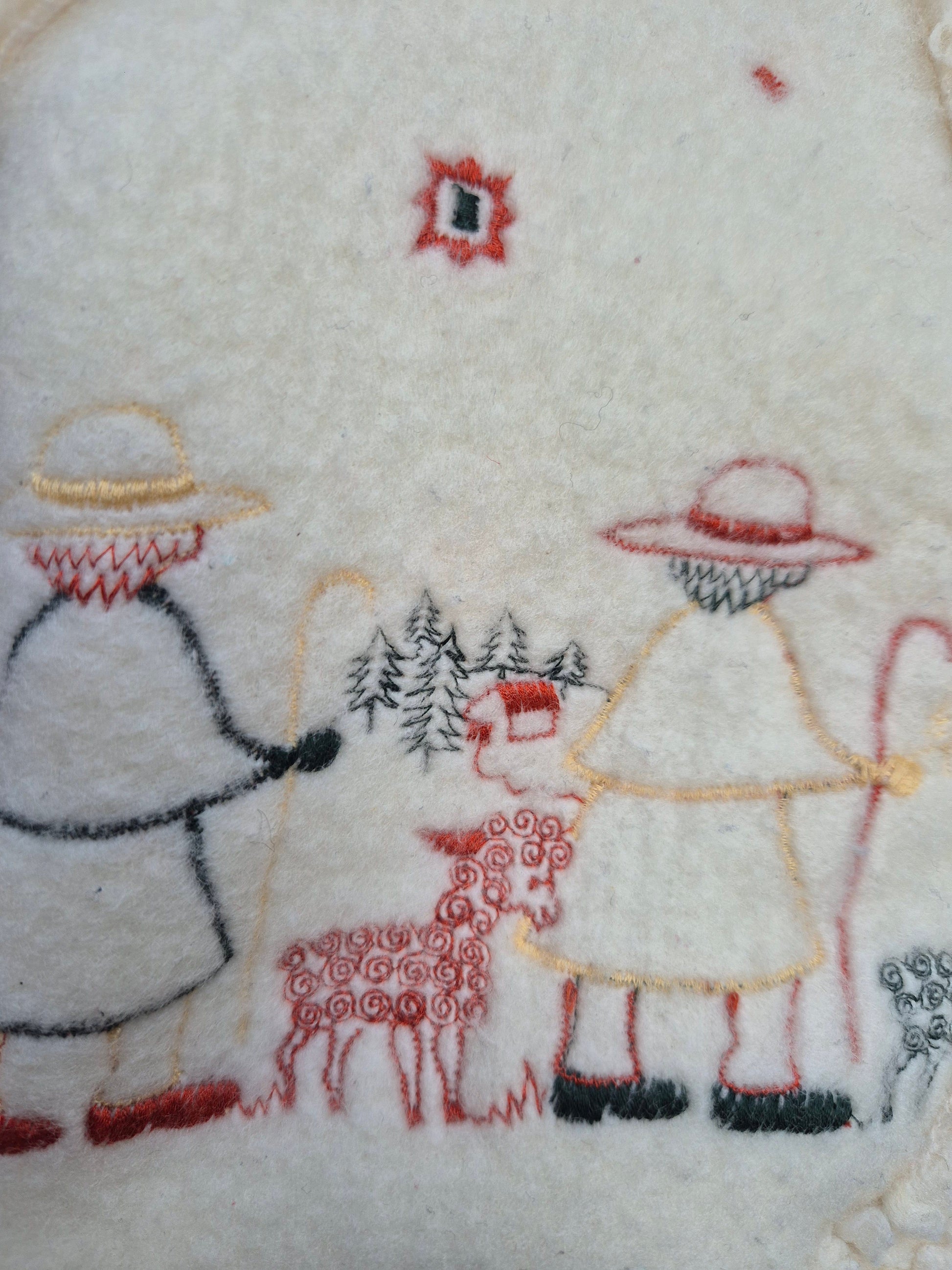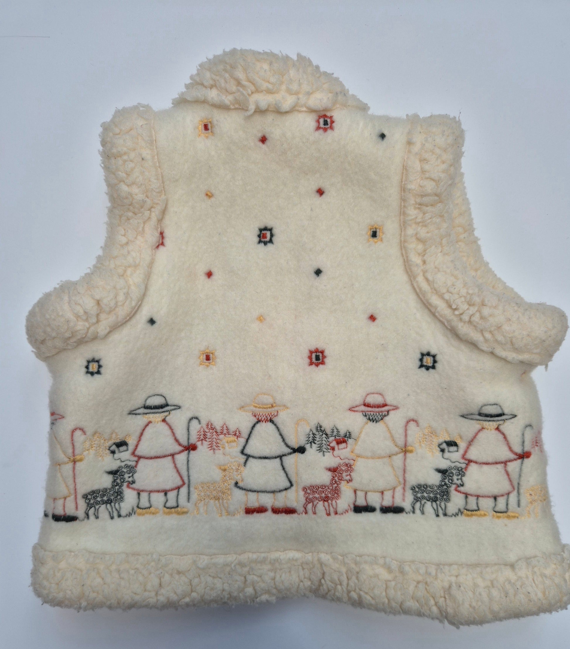 Zachte, wollige bodywarmer met geborduurde herders en dieren. Met houten knoopsluiting en warme voering. Een unieke vondst vol karakter.