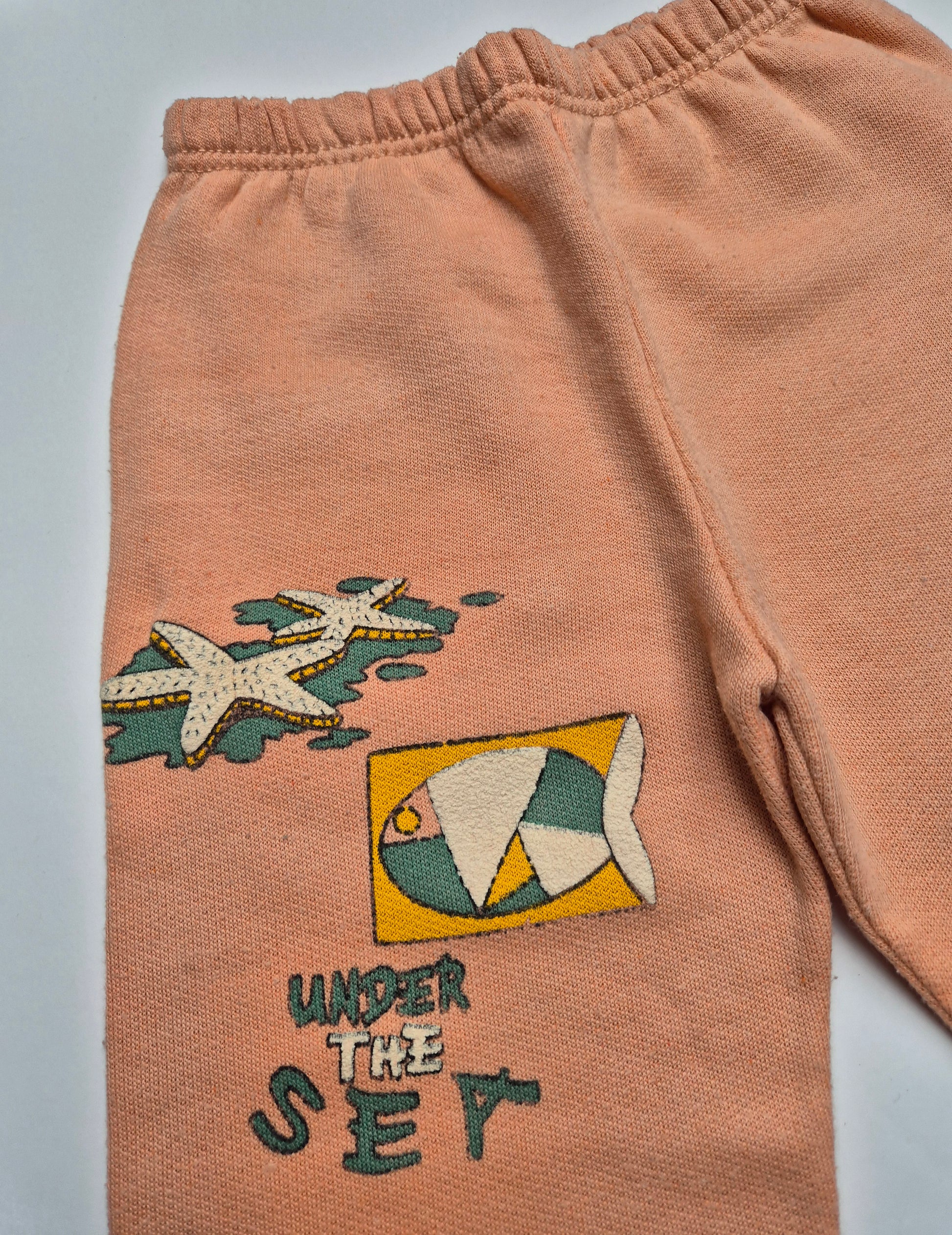Zachte broek met zeedierprint en tekst ‘Under the Sea’. Comfortabel en origineel, met subtiel retro-kleurtje.
